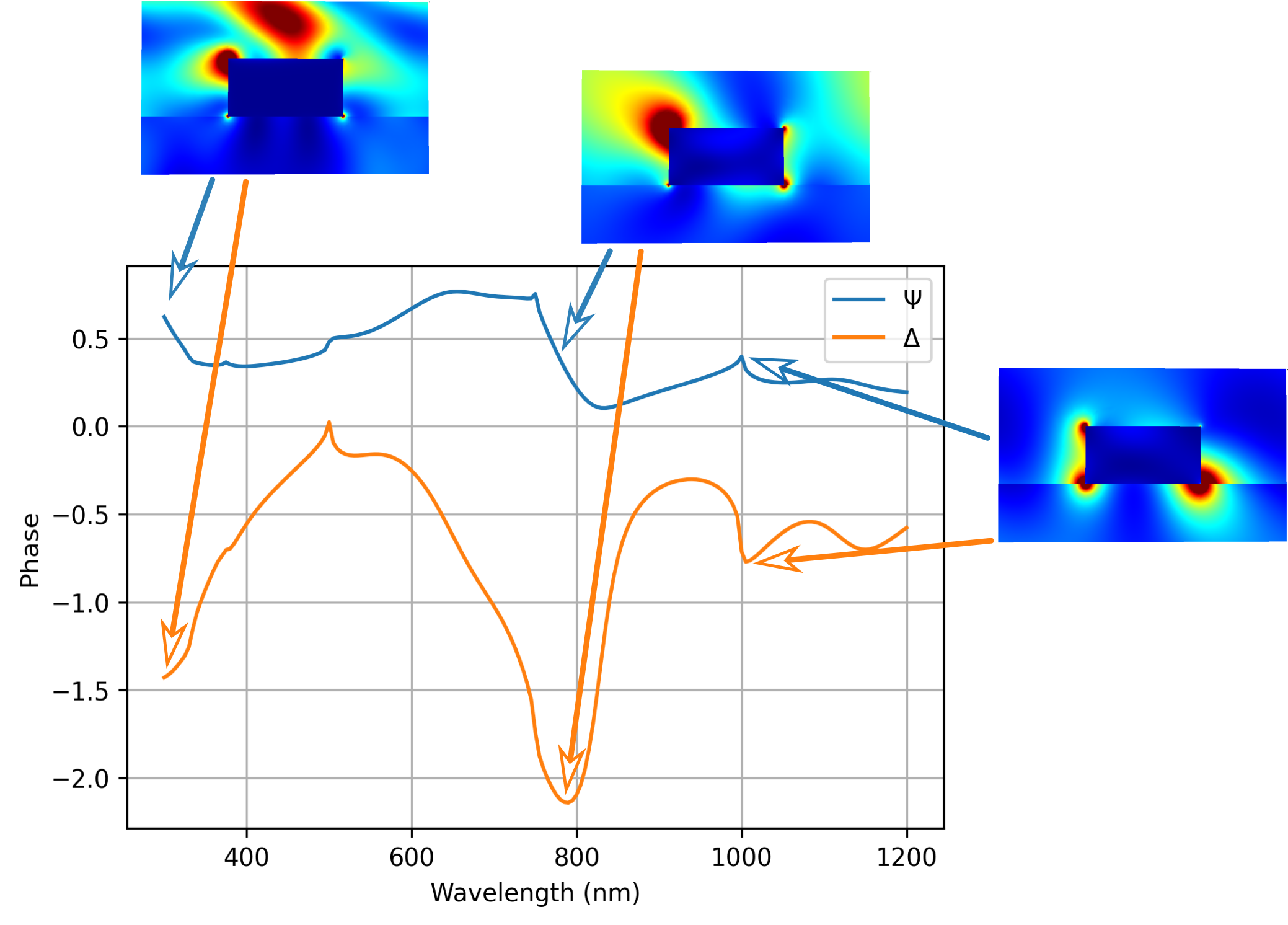 在对事件波长进行参数扫描后,我们可以绘制椭圆系数的依赖性图 Ψ 和 Δ .